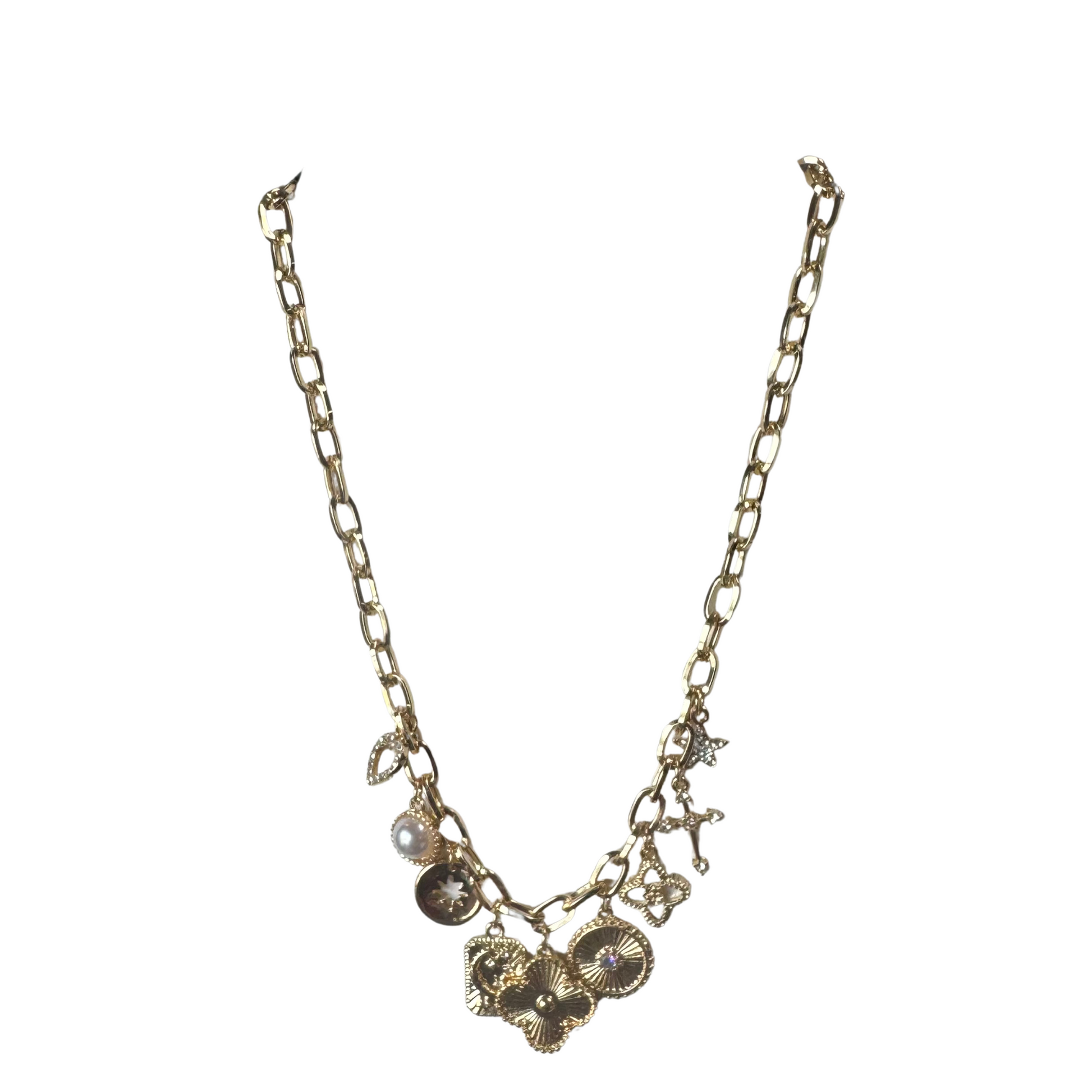 This elegant Charm Necklace features a charming gold design, perfectly accentuated by its short length. Crafted with a delicate touch, it adds a touch of sophistication to any outfit. Made for those who appreciate minimalistic yet chic pieces.