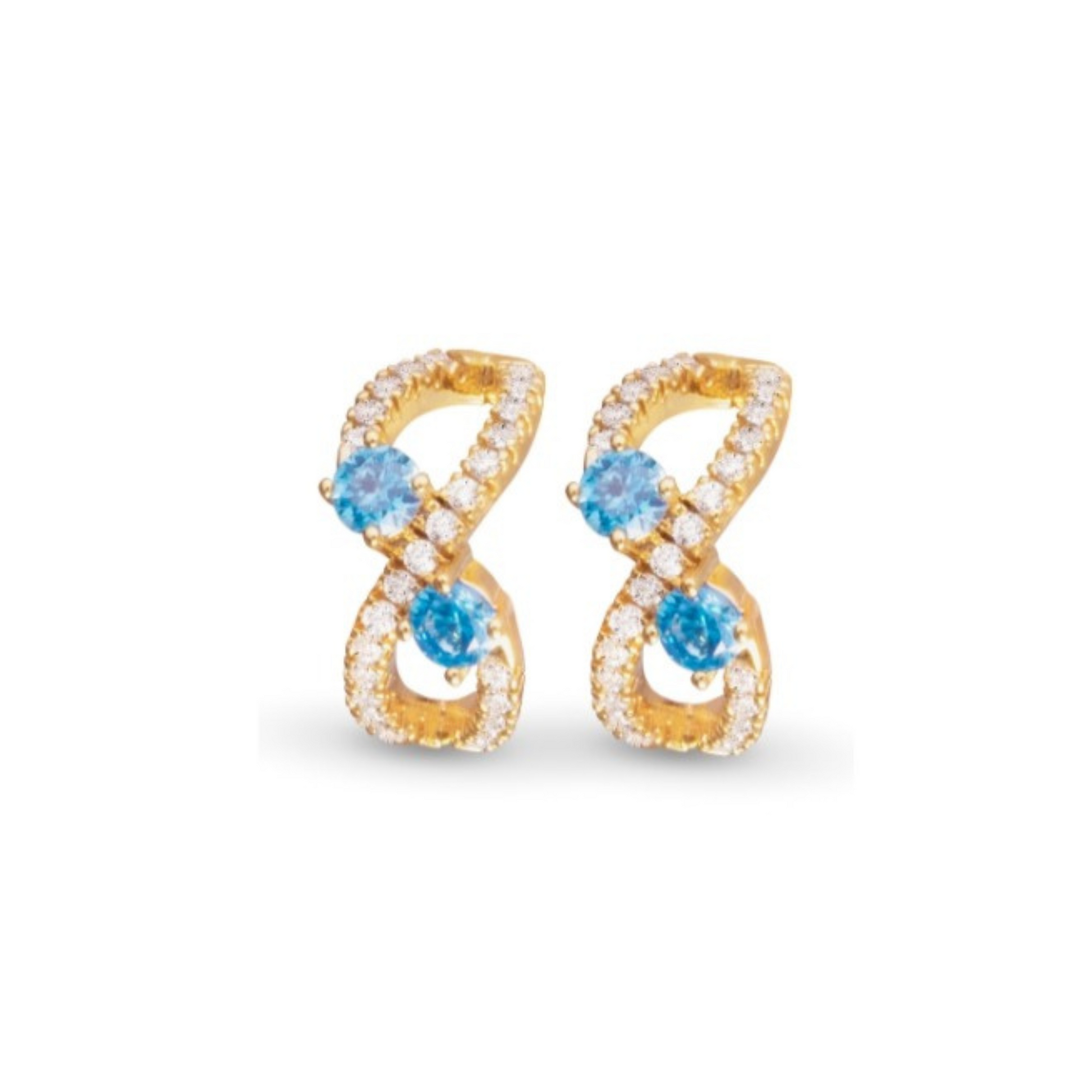 These Clear and Blue Infinity Huggie Earrings in Gold are the perfect blend of elegance and style. Made with 18K gold, the stud design features a sparkling blue stone that adds a touch of glamour to any outfit. Elevate your look with these timeless earrings.