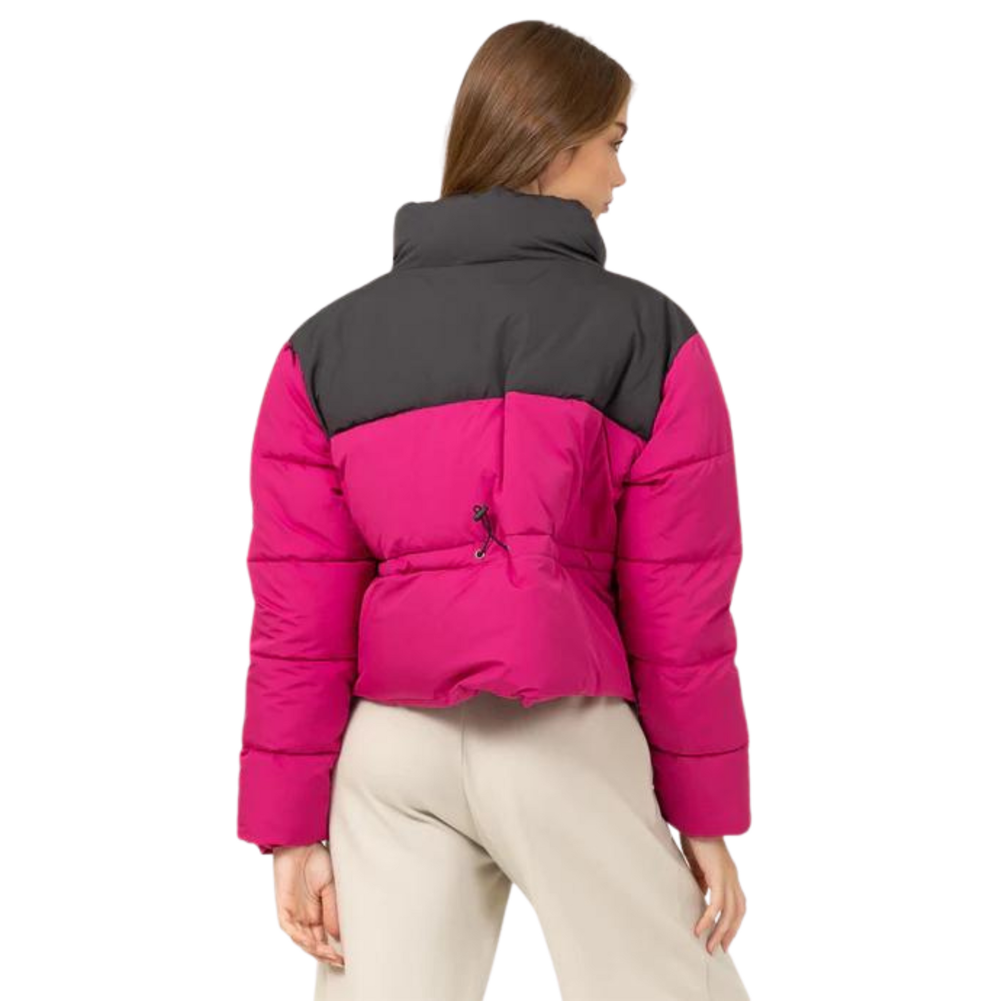 Look cool and stay warm in our Color Block Puffer Jacket. This stylish jacket features a high neckline and long sleeves to keep you cozy all day and night. The relaxed fit is just perfect for any look, and the front zipper closure ensures optimum warmth and comfort. Available in jam or pastel indigo.