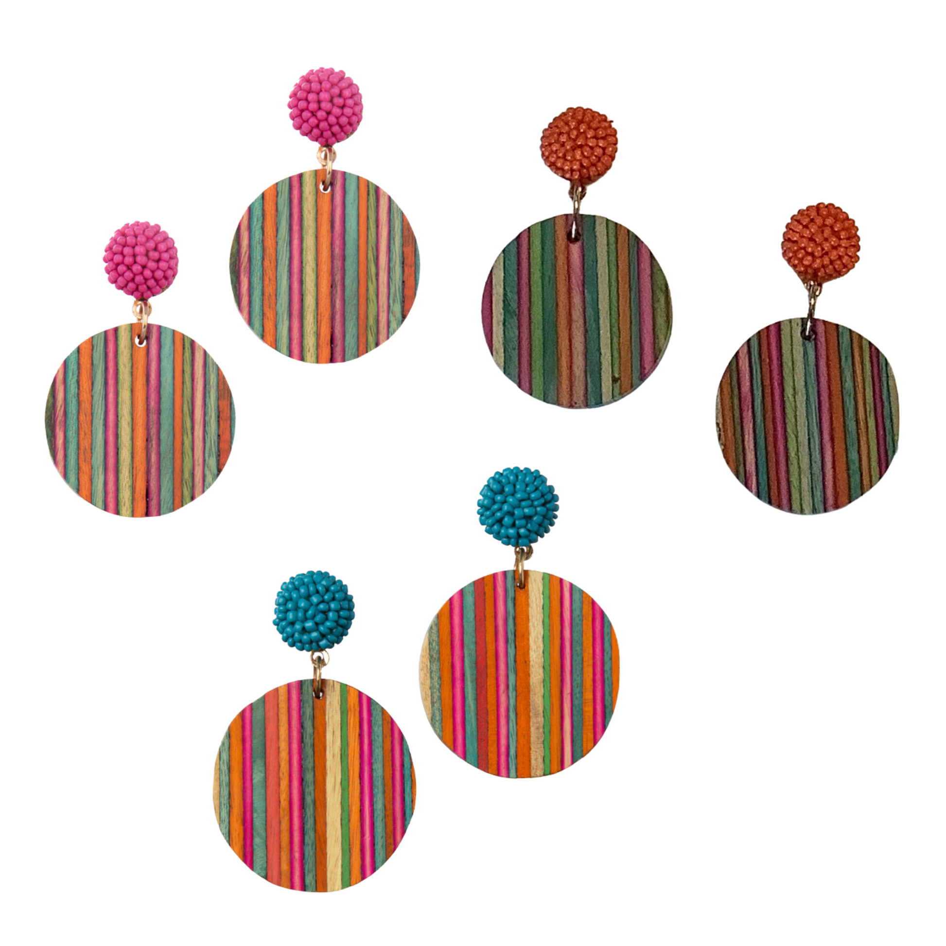 The Colorful Wood Stripe Earrings the unique statement piece you’ve been dreaming of! From the teal seed bead post to the vibrant colored wood, these earrings are so easy to wear and defines true style!