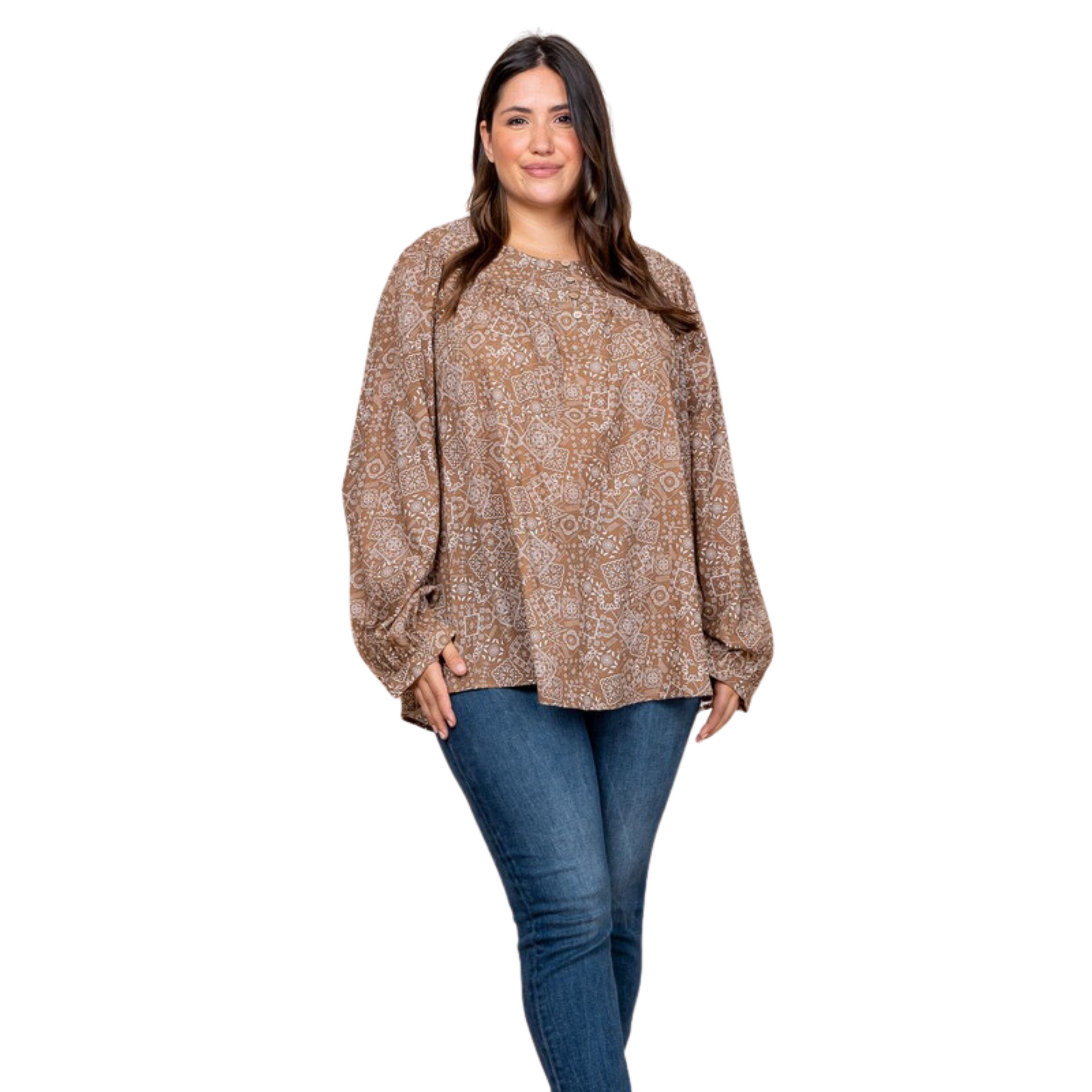 This ethnic-printed pull-over blouse is perfect for all occasions. With its plus-size cut and long sleeves, this blouse is designed to flatter while keeping you comfortable. Neutral colors suit any wardrobe, ensuring you look your best.