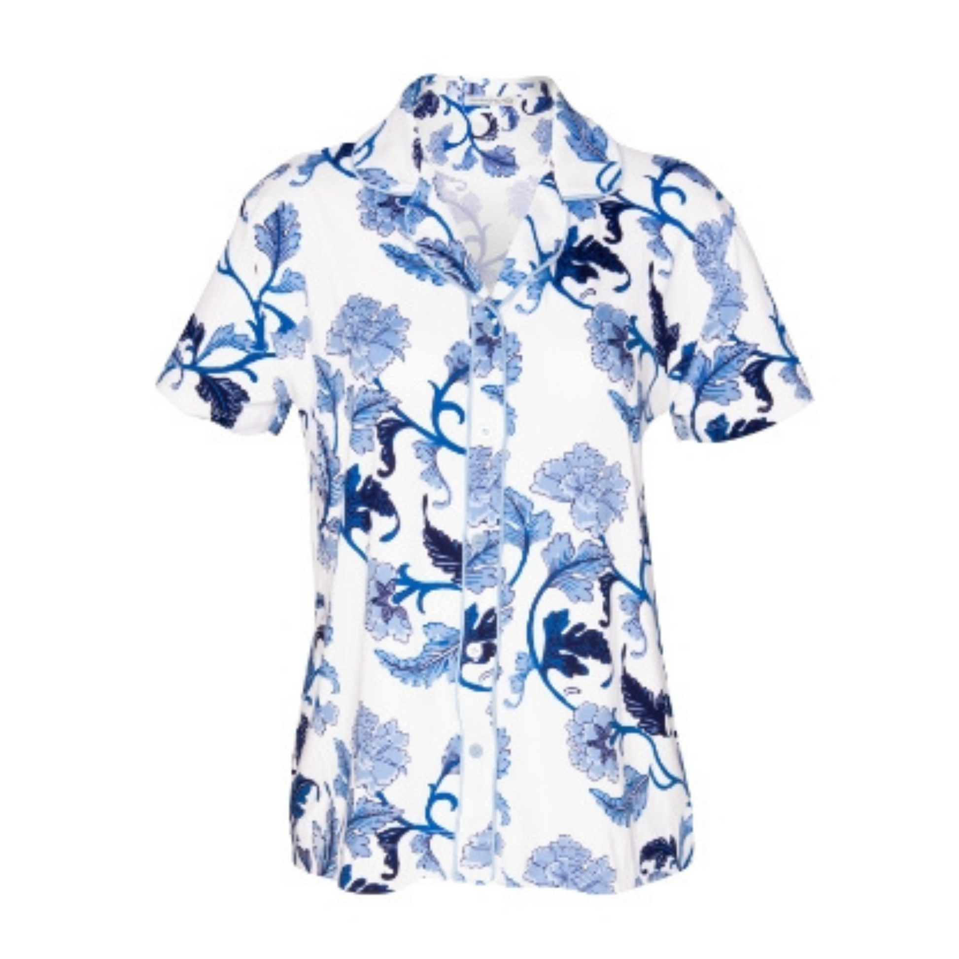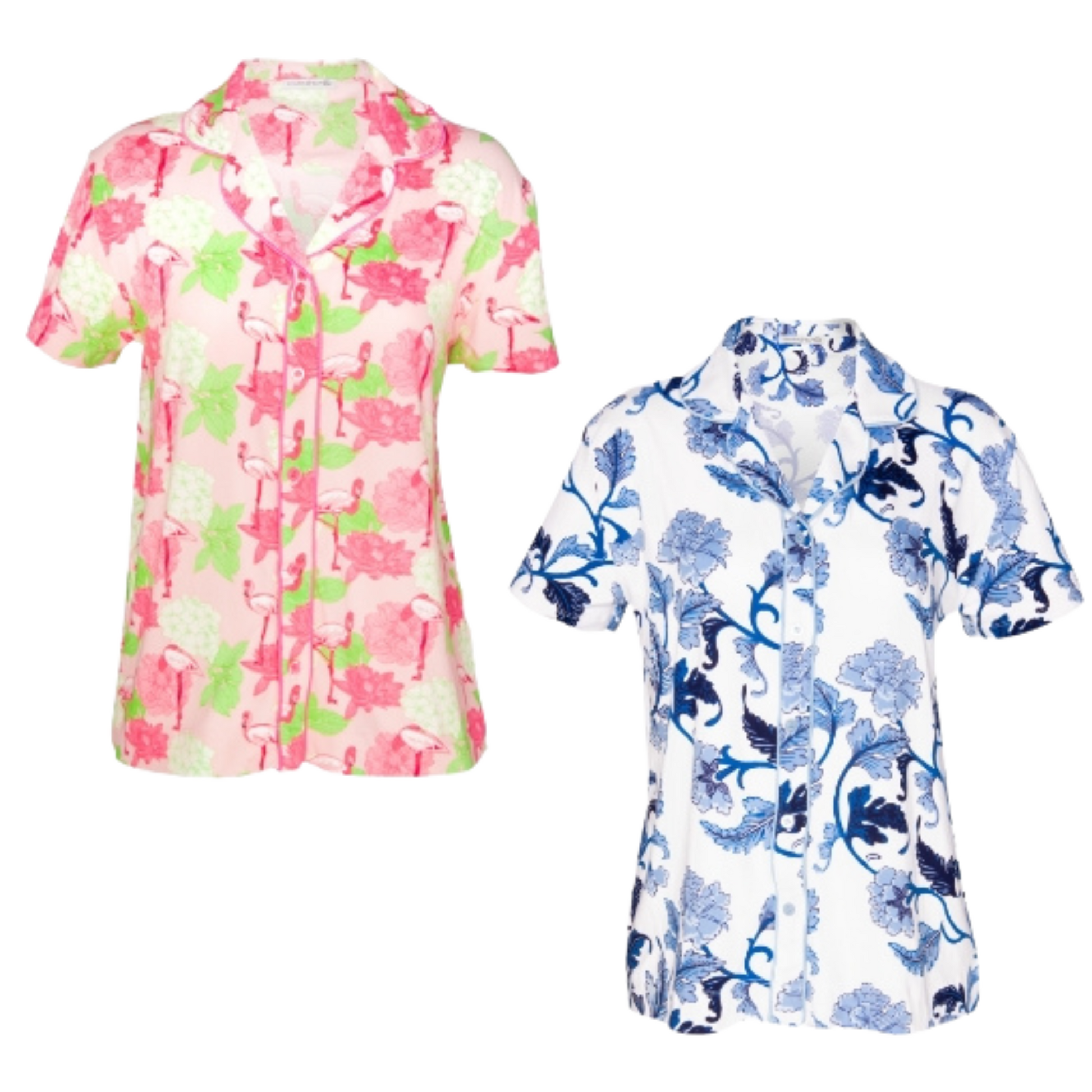 This Printed Notch Collar Pajama Top is the perfect addition to your sleepwear collection. The soft, short-sleeved top features a notched collar and button-down design, providing both comfort and style. Available in two stunning prints - hydrangea flamingo and blue acanthus leaf - to match both shorts and pants for a complete and coordinated look.